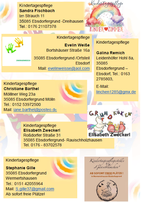 Kindertagespflege ist eine gesetzlich anerkannte, familiennahe Betreuungsform, die insbesondere für Kinder unter 3 Jahren der Betreuung in der Kita gleichgestellt ist. Die Kinder können in familienähnlichen Strukturen und einer kleinen Gruppe von maximal 5 Kindern je Kindertagespflegeperson (Tagesmutter/Tagesvater) erste Erfahrungen mit Gleichaltrigen sammeln. Die Tagesmutter/ der Tagesvater ist eine verlässliche Bezugsperson und gibt den Kindern Sicherheit und Ordnung. In der Kindertagespflege werden die Kinder in ihrer Entwicklung individuell begleitet, sie spielen gemeinsam mit anderen Kindern und lernen im sozialen Miteinander Grundlegendes, um sich in unserer Gesellschaft zurechtzufinden. Im familiären Umfeld erfahren sie Alltagsbildung, die eine Voraussetzung für schulische Bildung ist. Als Angebot der Jugendhilfe ist die Kindertagespflege in der Regel nicht teurer als ein Platz in einer Kita. Die Kindertagespflegeperson erhält vom öffentlichen Jugendhilfeträger (Landkreis Marburg-Biedenkopf) u.a. ein Entgelt für ihre Leistung und die Erstattung der Sachkosten.