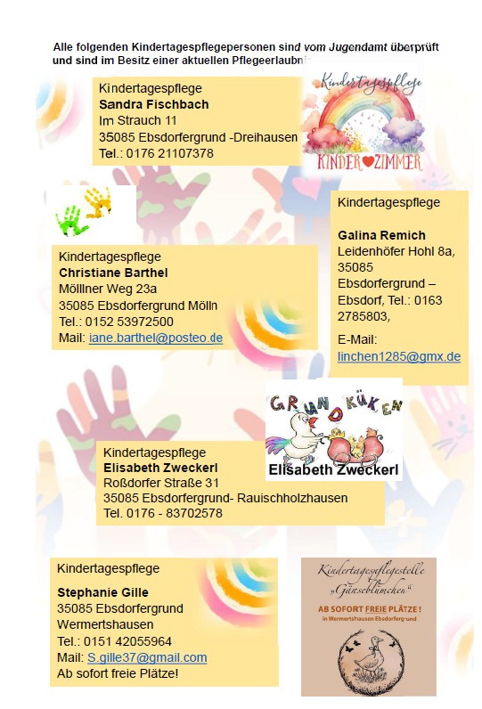 Alle folgenden Kindertagespflegepersonen sind vom Jugendamt überprüft und sind im Besitz einer aktuellen Pflegeerlaubnis: