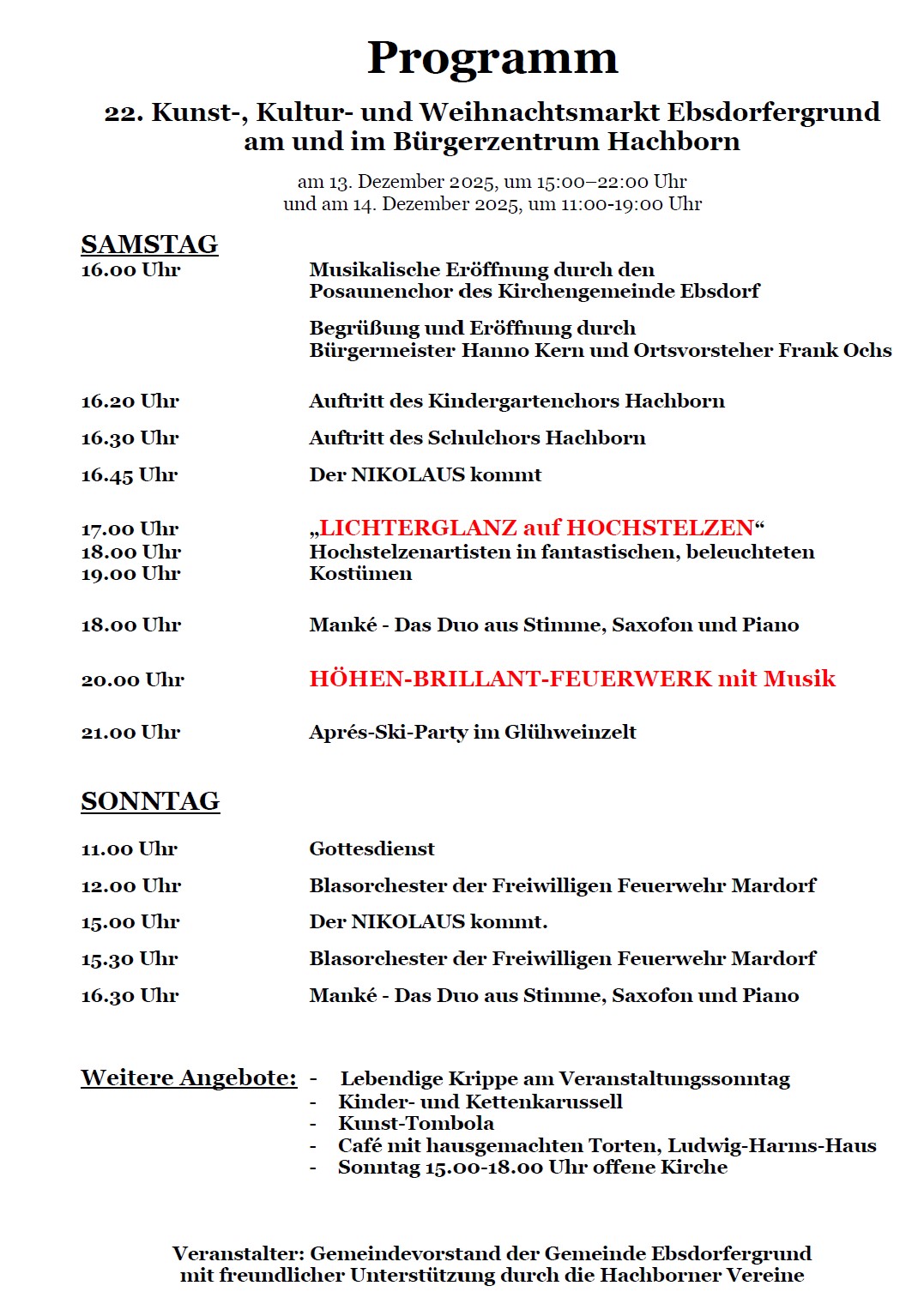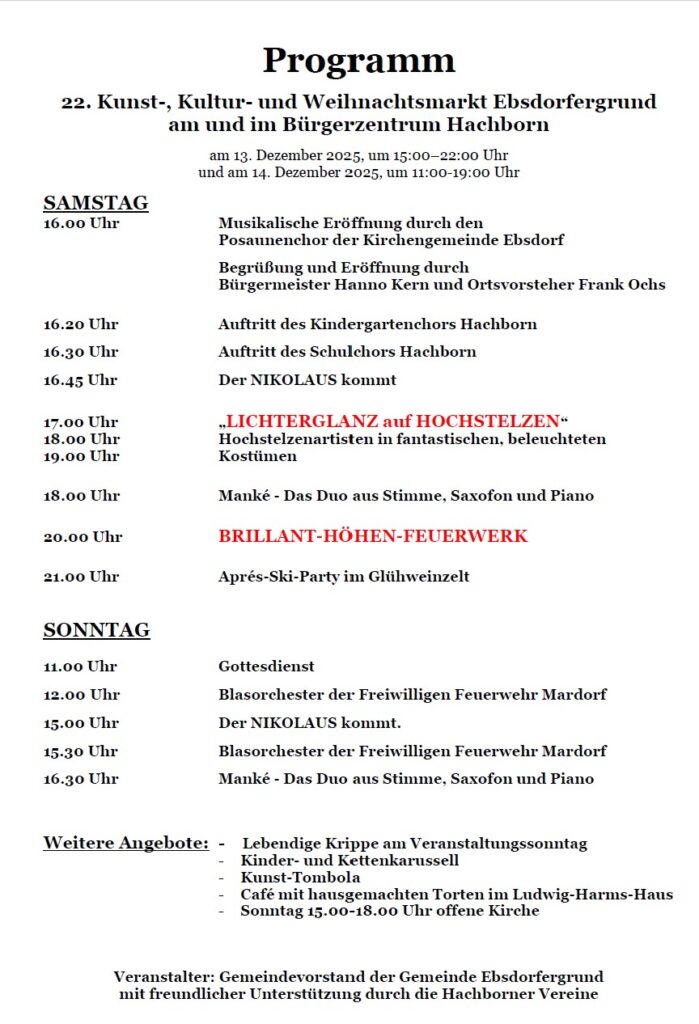 Auch in diesem Jahr findet der beliebte Kunst-, Kultur- und Weihnachtsmarkt in Hachborn statt. Am dritten Adventswochenende vom 13.-14. Dezember 2025 stellen diesmal fast 100 Standbetreiber ihre Kunst und ihr kunsthandwerkliches Können aus nah und fern im Bürgerzentrum Hachborn und in der Budenstadt vor.