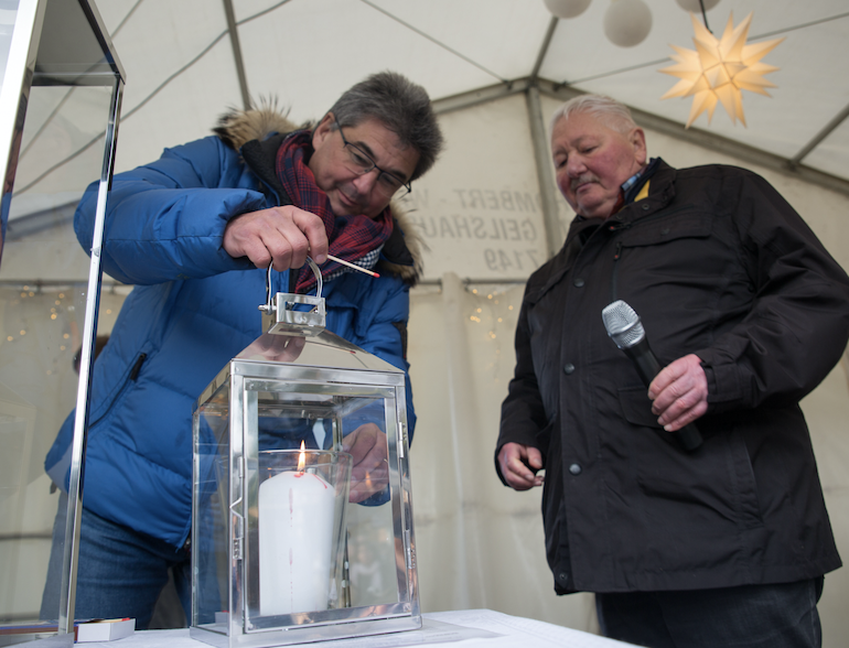 Bereits zur Eröffnung des Weihnachtsmarktes am Samstag waren tausende große und kleine Gäste da und applaudierten, als Bürgermeister Andreas Schulz den Markt und das Kulturprogramm gemeinsam mit Ortsvorsteher Jürgen Schäfer und mit musikalischer Unterstützung des Posaunenchors Ebsdorf und des Kindergartenchors und des Schulchors Hachborn eröffnete. „Wir leben in einer Zeit, in der Frieden brüchiger geworden ist. Deswegen feiern wir gemeinsam mit Ihnen allen, wir feiern gerne und friedlich mit Ihnen und wir wollen hier zeigen: wir setzen uns ein für eine friedliche Welt und ein friedliches Miteinander – im Ebsdorfergrund und darüber hinaus!“, so der Bürgermeister. Das zeigte er auch mit einem deutlichen Symbol. Denn in diesem Jahr wurde das Friedenslicht aus Bethlehem nach Hachborn gebracht, um dort das Licht weiterzugeben, eine weitere Kerze zu entzünden. Das Friedenslicht in Hachborn war ein lang gehegter Wunsch des Hachborner Gemeindevorstands Heinrich Rabenau, der sich in diesem Jahr erfüllte. Feierlich begleitet wurde die Ankunft des Friedenslichtes von der Drum-and-Pipe-Band „Targe of Gordon“ aus Fulda. Sie spielten auf und marschierten gemeinsam mit der Jugendfeuerwehr über den Weihnachtsmarkt, brachten das Licht durch die Menge bis zur Bühne.